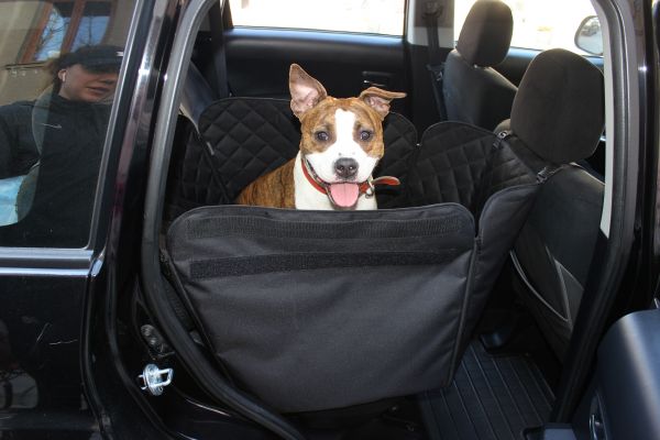 Автогамак для собак с защитой двери и порога автомобиля на половину заднего сидения.
