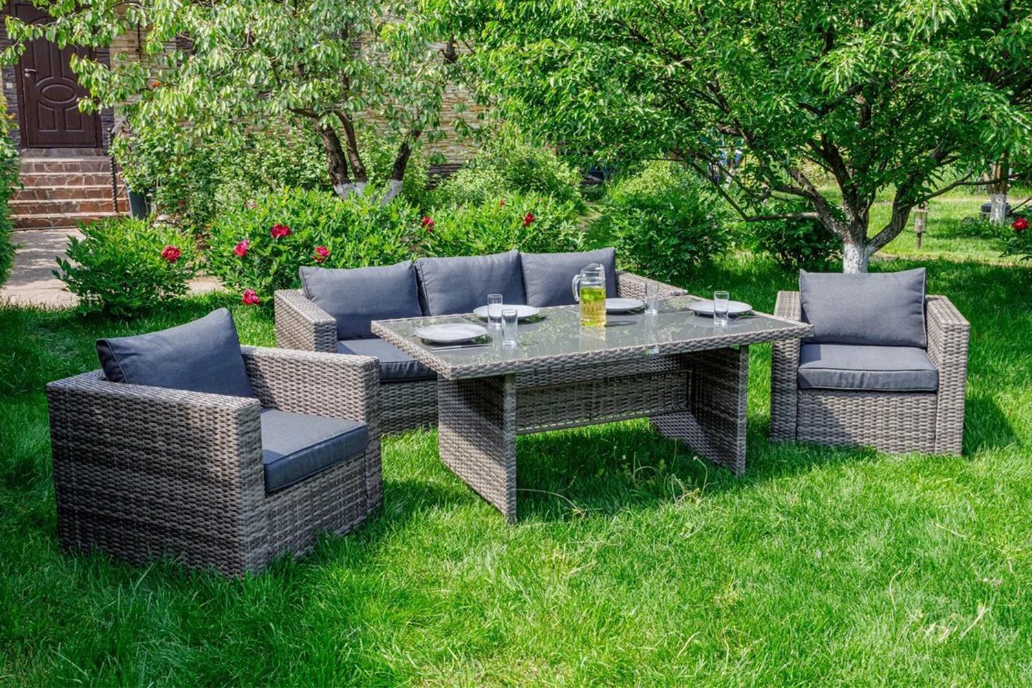 Набор уличной мебели – отличный вариант для обустройства места отдыха на природе. Набор мебели Карл состоит из трехместного дивана, двух кресел и обеденного стола. Спинки кресел и дивана – низкие, при этом очень красиво выглядят в плане общего дизайна. Оплетка всей мебели из искусственного ротанга серого цвета вовсе не скучна, и не привлекает лишнее внимание.