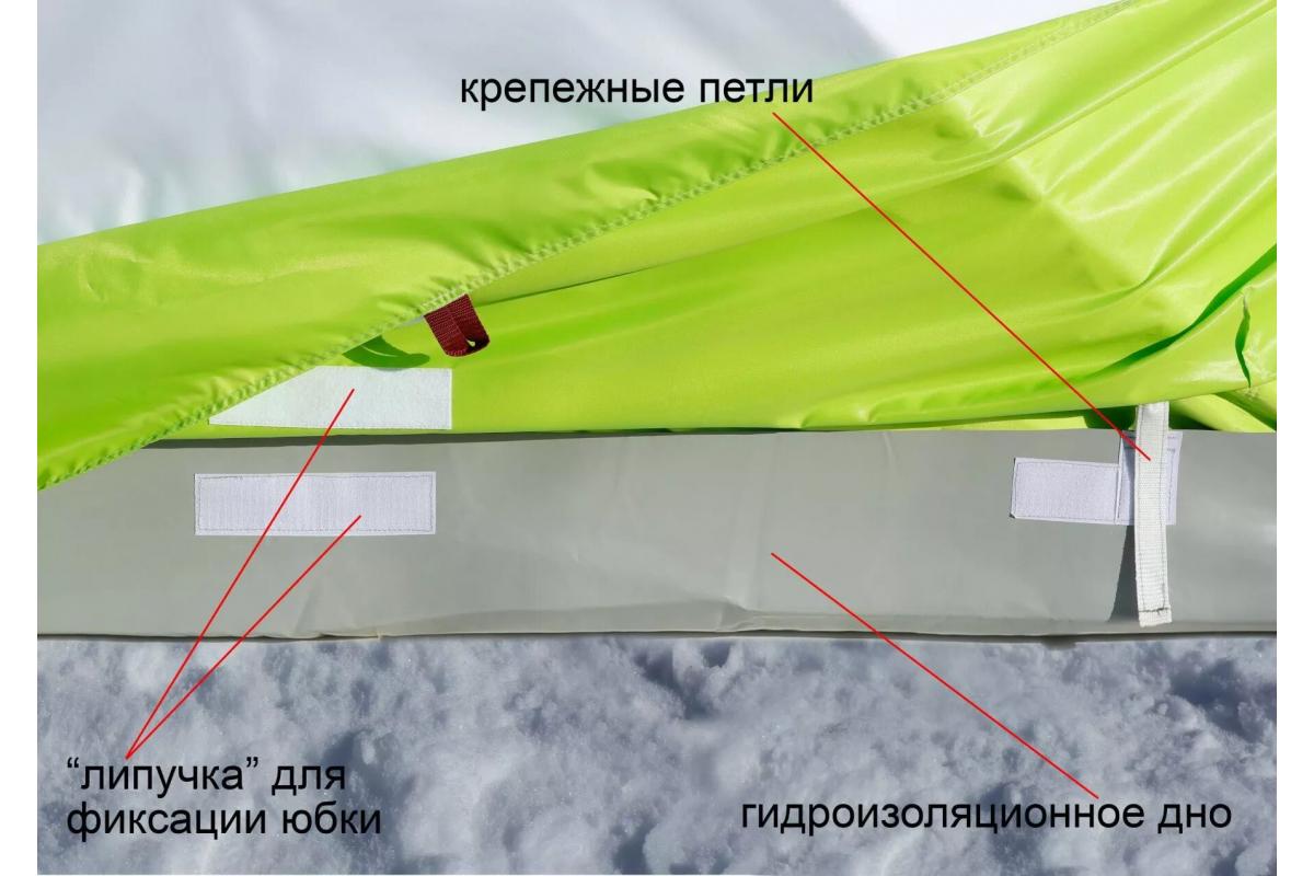 Дно гидроизоляционное может использоваться в комплекте с универсальной палаткой. Дно вкладывают в палатку, оно прижимается при помощи своих краев внутренней юбки к полу. Закрепляется при помощи бортиков внутренней части тента с использованием специальных липучек, которые устанавливаются на внутреннем тенте. Благодаря этому бортики занимают вертикальное положение. Внутренняя юбка располагается во внутренней части дна, а внешняя на внешней части дна.
