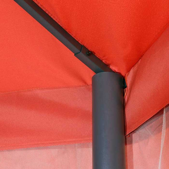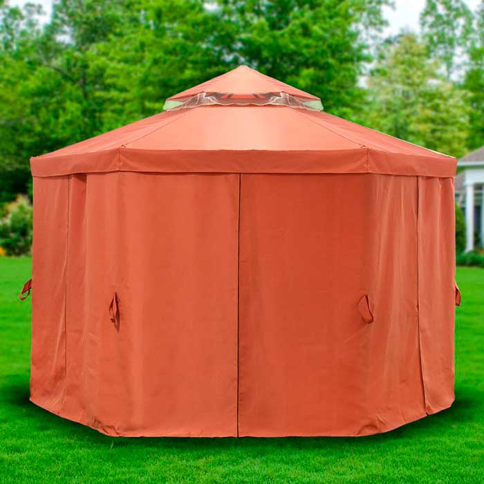 У нас вы можете купить комплект, который, который предназначен на шатёр для дачи. В данный комплект входит крыша-тент с клапаном для циркуляции воздуха, москитная сетка, а также плотные шторы. Весь комплект выполнен в терракотовом цвете. Это отличный выбор для отдыха с комфортом, он пригодится всем тем, кто любит отдыхать на свежем воздухе. Крыша изготовлена из полиэстера с плотностью 160 г, боковые стенки из полиэстера 140 г с москитной сеткой. Будьте уверены, данный комплект прослужит вам не один сезон.