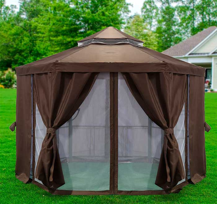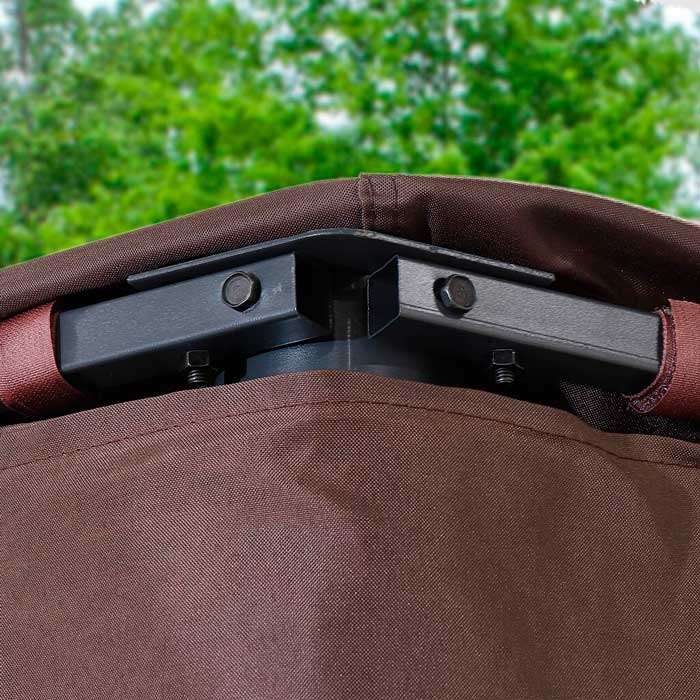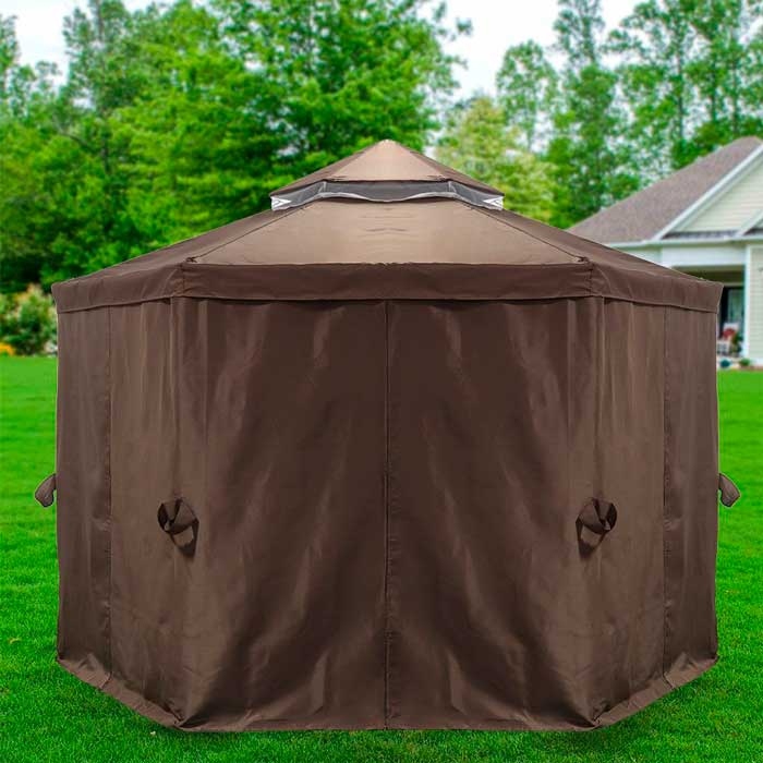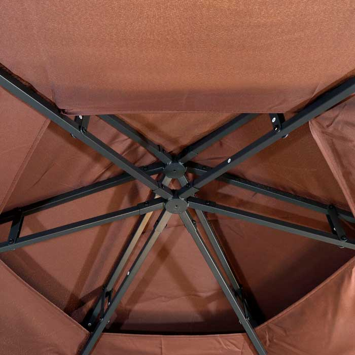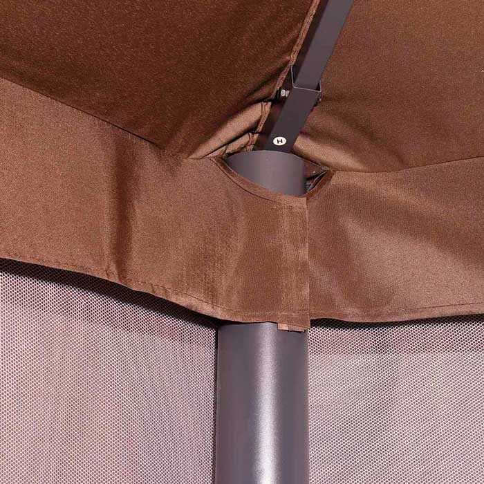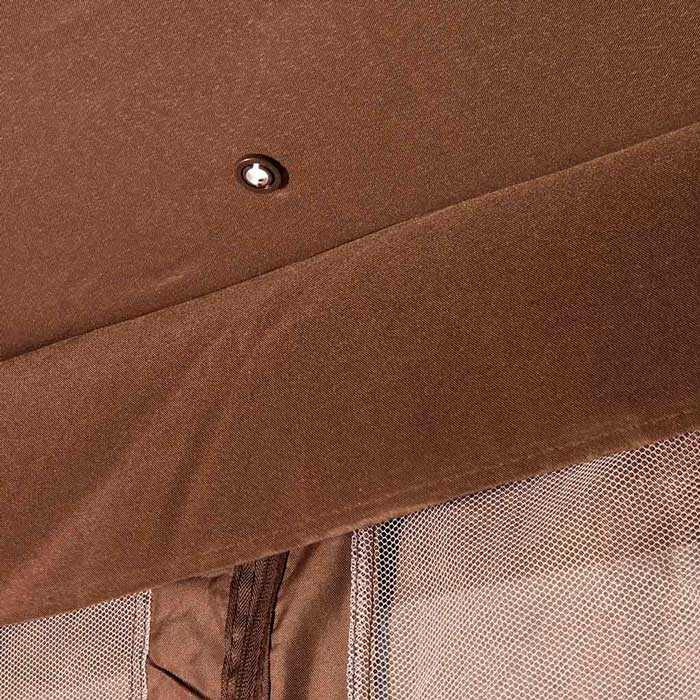 Хотим предложить вам купить тент на шестиугольный шатёр. Данная крыша-тент выполнена в коричневом цвете, она двойная, имеет клапан для проветривания, который также защищён москитной сеткой.