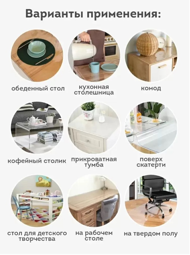 Толстая пленка ПВХ 2 мм часто используется в качестве мягкого стекла на стол (другое название - прозрачная силиконовая накладка на стол или силиконовая скатерть).